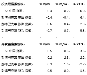 上周MSCI发达市场指数下跌0.4%,新兴市场指数上涨1.1%。标普500指数下跌0.5%,欧洲STOXX600指数下跌1.4%。中国沪深300指数下跌1.5%,创业板指下跌4.5%。