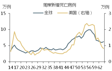 自今年1月中旬之后全球新增病例呈现明显改善态势,不过2月中下旬欧洲及新兴经济体迎来了第三波疫情高峰。截止2021年3月24日,除中国外全球新冠肺炎累计确认病例逾1.25亿例,累计死亡逾275万人。2月日均增量为40万例,下降至2020年11月以来新低,但进入3月之后日均增量上升至44万例,整体处于较高水平。其中美国3月日均新增下降至6万左右,周度新增死亡病例亦呈现明显回落,创2020年11月以来新低。