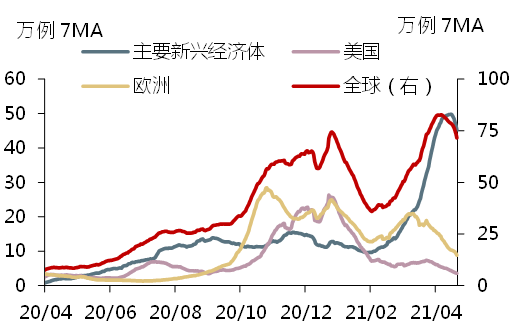 作者 | 闫星月 本报告发表于:2021年5月17日 宏观及大类资产配置周报观点摘要 上周全球新增确诊人数有所好转,疫苗接种率小幅提速。主要在于欧美地区和新兴经济体的疫情状况有所改善。但值得注意的是,由于印度疫苗厂商反映原材料紧缺与管控体系的不协调,印度疫情状况依旧严峻,受此外溢影响,东南亚国家面临着疫情再度爆发的风险。从疫苗接种来看,因中国和印度接种提速,令新兴经济体接种速率整体呈现上行态势,而发达经济体接种速率持续下行。另外基于印度尼西亚的接种现状我们得知,SinoVac疫苗表现良好,对变异毒株有很好的保护效率,预计将在变异病毒较高的区域得到广泛使用。 上周全球权益类指数全面走低,其中MSCI发达市场指数下跌1.4%,MSCI新兴市场指数大幅下跌3%,全球股市全面走低反映了市场对于通胀和经济发展的变化的预期。后期需要关注美国通胀高增持续的时间,若二季度后期呈现逐步回落态势,对权益类指数压力将减弱。与新兴市场的普遍低迷不同,A股表现良好。其上行主要系国内经济基本面稳定。对于后期而言,随着结构性逐步平稳,我们更加看好消费、服务性和制造业行业。 美债收益率上周止跌企稳,主要源自于对全球通胀担忧情绪的上升。不过随后联储多位官员发表了关于通胀水平的言论,整体来看联储对通胀水平有较高的容忍度。之后美国零售数据的公布,进一步加强了市场对联储短期不会缩减购债规模预期,令美债收益率周五呈现回落之势。 上周美元指数上涨0.1%,收于90.38,新兴市场货币指数下跌0.3%。美元指数回落与美债收益率下行逻辑较为一致,即主要取决于市场对联储政策收缩预期的变化,此外还有美国经济面发展预期相比欧洲良好的因素。原油上行主要受到供需方面的扰动,布伦特原油价格上涨0.6%,收于68.72美元/桶,WTI原油上涨1.95%,收于64.82美元/桶。上周供给的减少和需求情绪的增长,刺激了原油价格的上行。同时,出于对印度疫情的担忧,国际能源署略微下调了对原油未来需求的预期。除此之外,数据表明印度五月原油需求有所减少,为石油需求复苏带来了不确定性。 本周主要看点: 数据方面:中国:4月宏观经济数据、5月一年期贷款市场报价利率(LPR);日本:日本一季度实际GDP年化季环比初值;美国:4月新屋开工及营建许可数据、4月成屋销售总数年化(万户);欧洲:欧元区一季度GDP同比数据、4月通胀数据、欧元区及主要国家5月制造业PMI初值。 政策事件方面:欧元区:5月欧元区财长会议,5月欧洲央行公布金融稳定评估报告,5月英国央行金融政策委员会外部委员发表讲话,5月欧元集团会议;美国:5月美联储将公布会议纪要。 正文 重要经济数据分析 中国:4月CPI-PPI剪刀差负向扩大显示经济修复不均衡 中国4月CPI同比增长0.9%,预期1.0%,前值0.4%;PPI同比6.8%,预期6.5%,前值4.4%。环比角度来看,CPI环比下降0.3%,PPI环比增加0.9%。CPI-PPI剪刀差负向扩大至-5.9%,显示经济总需求修复不均衡。 CPI环比降幅收窄,服务消费持续回升。4月CPI同比不及预期主要受到食品项的拖累下降0.7%,影响CPI下降约0.14个百分点;而非食品项则成为CPI的主要驱动力上涨1.3%,影响CPI上涨约1.05个百分点。整体反映出在经济活动恢复、叠加假日因素服务消费的持续改善。从拉动CPI增长分项来看除食品为负向拉动外,其余均为正向拉动,主要是受到交通和通信以及教育文化和娱乐的拉动。其中交通和通信对CPI拉动率大幅升至0.55%,创有数据以来新高,其同比增速达4.9%,一方面在于原油价格的上涨导致交通工具燃料呈现持续大幅上行态势,当月同比由前值的11.5%上升至19.4%,另一方面由于清明假期因素,使得居民出行大幅增加,令交通工具使用和维修以及通信工具呈现显著回升态势。教育文化和娱乐对CPI的拉动从前期0.05%上升至0.18%,主要与假期消费因素有关,其中旅游环比增速由前值-4.2%大幅上升至4.7%。之不同的是食品项对CPI的拉动与前值持平,主要因猪肉价格连续5个月下降,猪肉当月同比下降-21.4%,创2009年8月以来新低,同时鲜菜类当月同比增速转为负增长为-1.3%,创去年5月以来新低,拖累食品项下降至-0.7%,对CPI的拉动为-0.2个百分点,创2018年8月以来新低。 PPI表现超预期主要因大宗商品驱动和低基数效应,共同推动了上游采掘工业和原材料价格上升。具体来看,PPI中生产资料当月同比大幅上升至9.1%,对PPI的的拉动率大幅上升至6.76%,均创2017年4月以来新高,其中采掘工业和原材料工业当月同比分别上升至24.9%和15.2%,分别创2017年4月和2017年3月以来新高。不过从环比角度来看,PPI有所下行,生产资料分项指数除采掘工业继续上行,其余均呈现回落态势,主要是受到原油、有色行业价格涨幅趋缓的影响,而采掘工业的上行主要受到铁矿石等原材料成本上升的影响。 展望:PPI的上行幅度仍将高于CPI,剪刀差负向有望收敛。通过领先指标22省市猪粮比价来看,预计食品项已见底,后期将呈现逐步回升态势,同时受翘尾因素和内需改善下非食品项上升带来的新涨价因素,和PPI对CPI的传导,预计CPI或于6月达到全年高点至2.6%,随后逐步回落。PPI方面继续受到全球工业生产需求对大宗商品的推动(疫情改善、OPEC限产延长、美国财政刺激落地,各国补库周期开启),同时国内二季度进入投资旺季,也会加大工业生产需求,国际和国内需求共同推动新涨价因素,叠加翘尾因素和金融周期对PPI的领先关系来看,PPI预