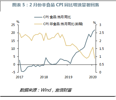 具体看,2月CPI食品价格同比从1月的20.6%上升至21.9%。其中,猪肉价格同比增速从1月的116%上升至2月的135%。2月非食品CPI同比增速明显回落,从1月的1.6%大幅下降至0.9%,月环比收缩0.2%。