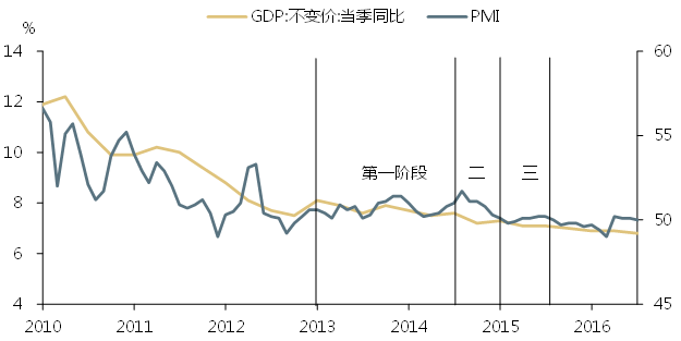 在2013-2015年间,中国的经济增速已经处于缓慢下行趋势之中,GDP增速从2012年四季度的8.1%下滑至2015年四季度的6.9%。制造业PMI震荡起伏,一度下跌入收缩区间,平均水平相较于2010-2012年的53左右有明显下台阶。